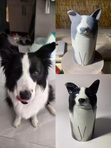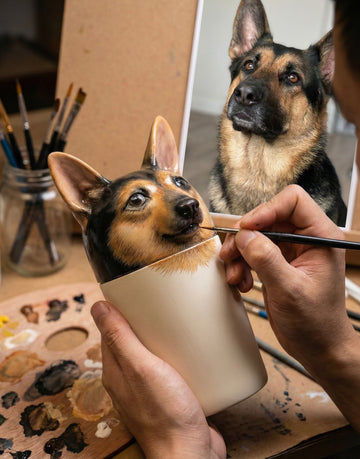 Master ceramic painters hand-paint your companion's likeness onto a sculpted urn. This is interpretive art—honoring their essence, not replicating a photograph.